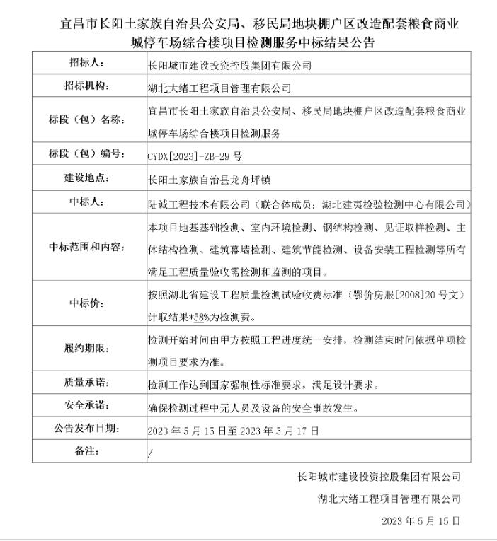 宜昌市长阳土家族自治县公安局、移民局地块棚户区改造配套粮食商业城停车场综合楼项目检测服务中标结果公告
