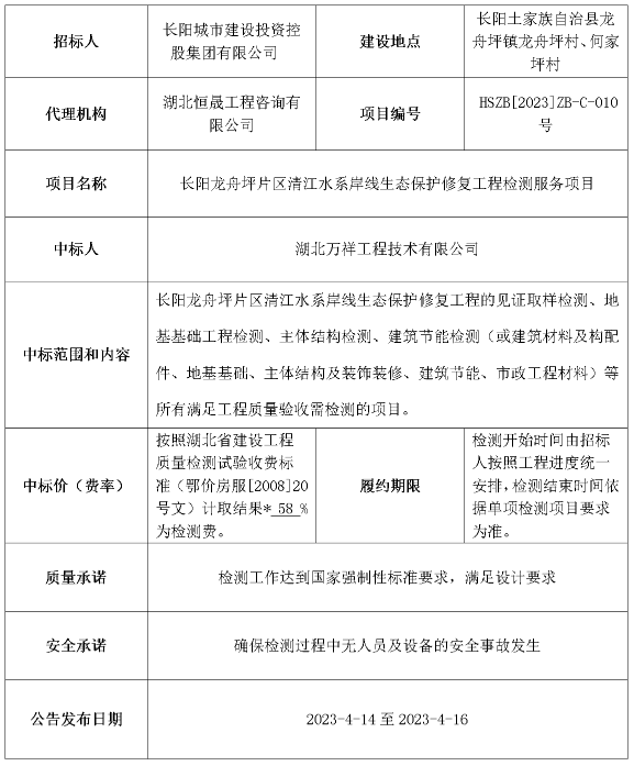 长阳龙舟坪片区清江水系岸线生态保护修复工程检测服务项目中标结果公告