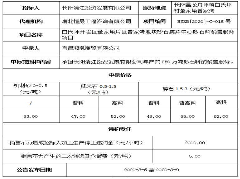 白氏坪开发区董家坳片区曾家湾地块砂石集并中心砂石料销售服务项目中标结果公告
